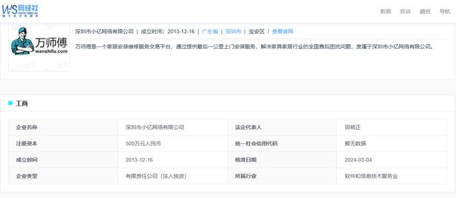 据网经社企业库显示,万师傅是深圳市小亿网络有限公司,注册于广东省深圳市,法定代表人田晓正。
