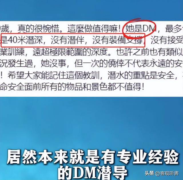 或许是经历了40米级别的休闲潜水之后,张晓涵觉得自己已经掌握了所有技巧,所以才会判断失误,觉得凭借一己之力便呢拿回重要的相机。