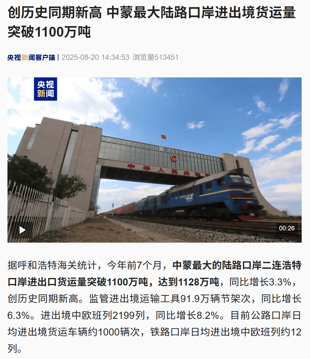 ●8月20日,《央视新闻》客户端发布文章《创历史同期新高 中蒙最大陆路口岸进出境货运量突破1100万吨》。(二连海关供稿)