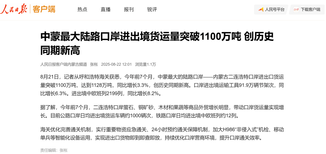 ●8月22日,《人民日报》客户端发布文章《中蒙最大陆路口岸进出境货运量突破1100万吨 创历史同期新高》。(二连海关供稿)
