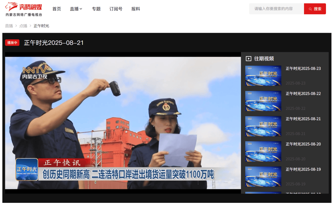 ●8月21日,内蒙古卫视《正午时光》发布视频《创历史同期新高 二连浩特口岸进出境货运量突破1100万吨》。(二连海关供稿)
