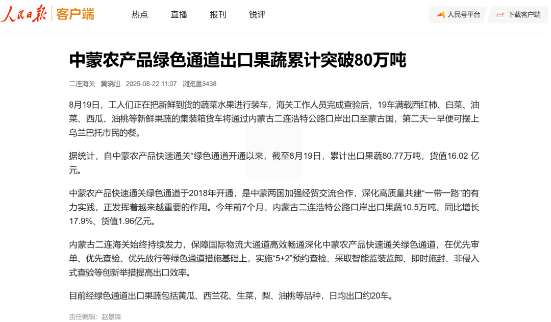 ●8月22日,《人民日报》客户端发布文章《中蒙农产品绿色通道出口果蔬累计突破80万吨》。(二连海关供稿)