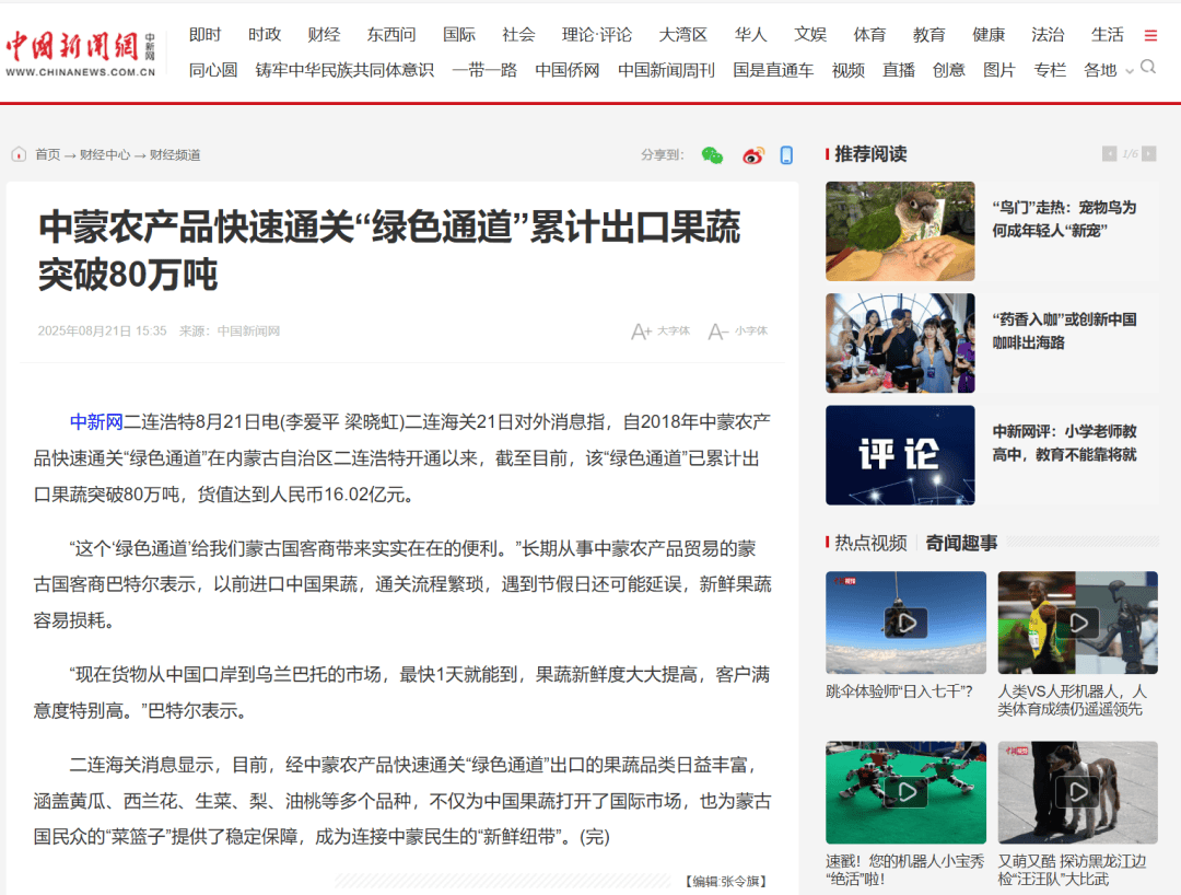 ●8月21日,中国新闻网发布文章《中蒙农产品快速通关“绿色通道”累计出口果蔬突破80万吨》。(二连海关供稿)