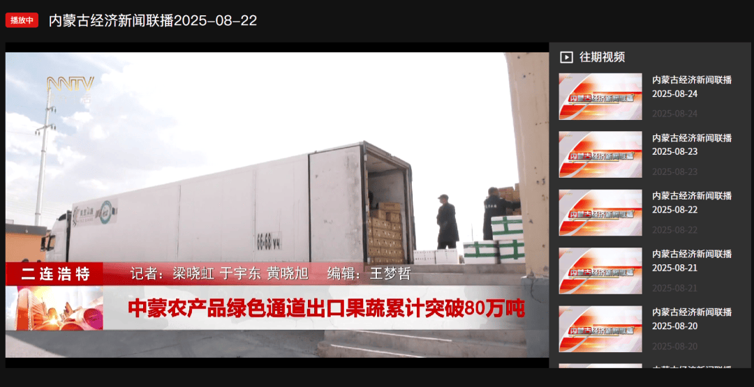 ●8月22日,《内蒙古经济新闻联播》发布视频《中蒙农产品绿色通道出口果蔬累计突破80万吨》。(二连海关供稿)