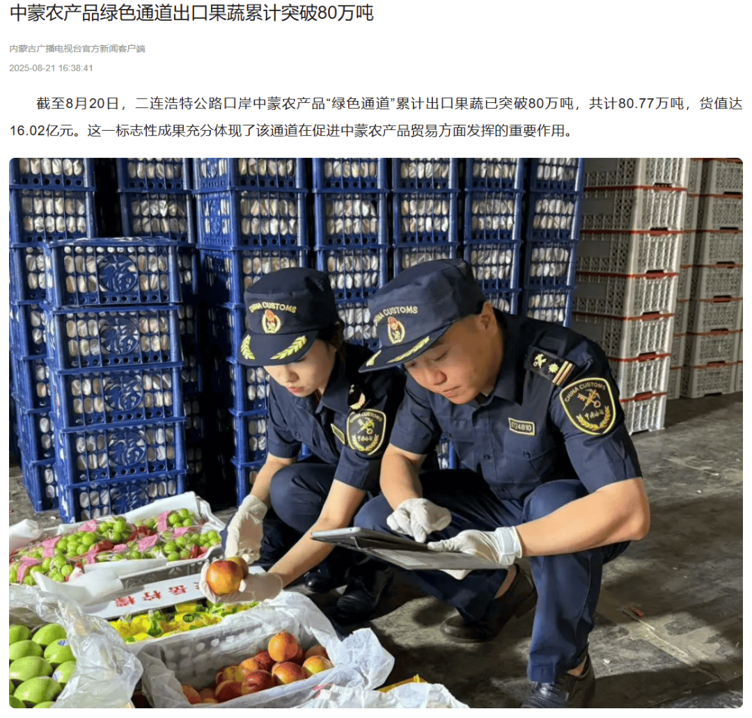 ●8月21日,《奔腾融媒》发布文章《中蒙农产品绿色通道出口果蔬累计突破80万吨》。(二连海关供稿)