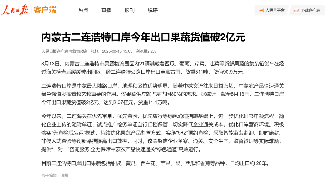 ●8月13日,《人民日报》客户端发布文章《内蒙古二连浩特口岸今年出口果蔬货值破2亿元》。(二连海关供稿)