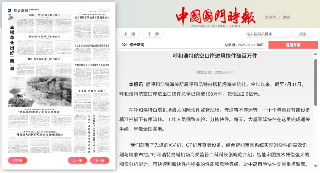 ●8月14日,《中国国门时报》发布文章《呼和浩特航空口岸进境快件破百万件》。(呼和浩特白塔机场海关供稿)