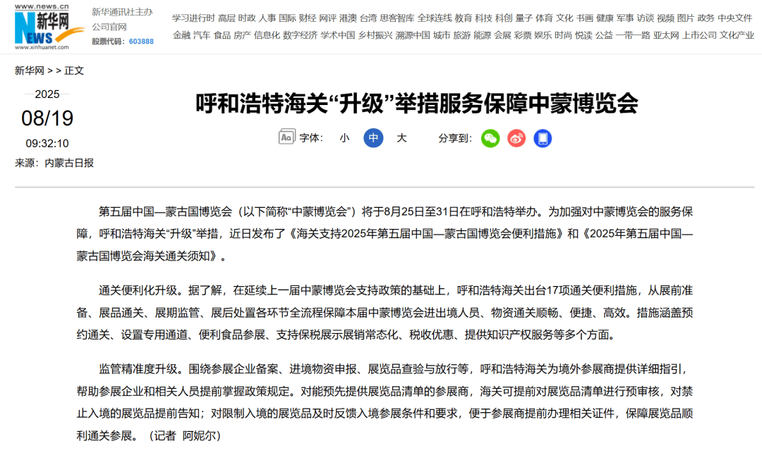 ●8月19日,新华网发布文章《呼和浩特海关“升级”举措服务保障中蒙博览会》。(口岸监管处供稿)