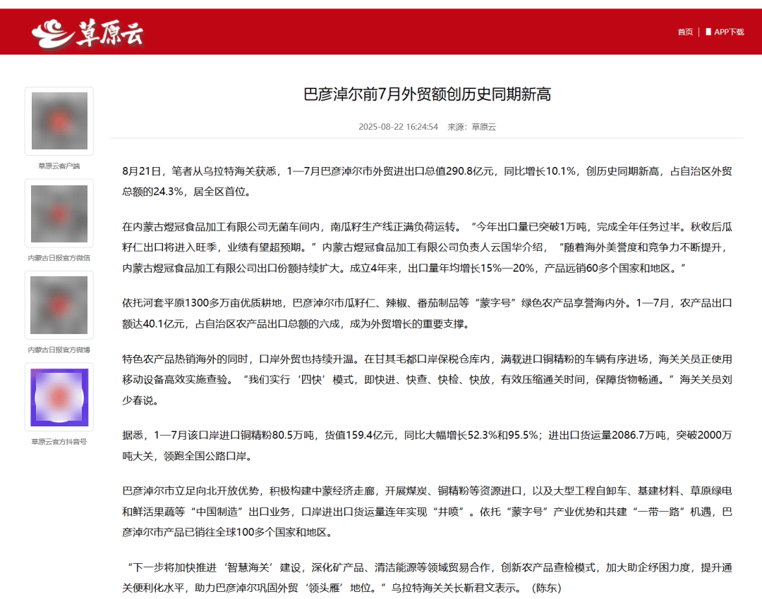 ●8月22日,《草原云》客户端发布文章《巴彦淖尔前7月外贸额创历史同期新高》。(乌拉特海关供稿)