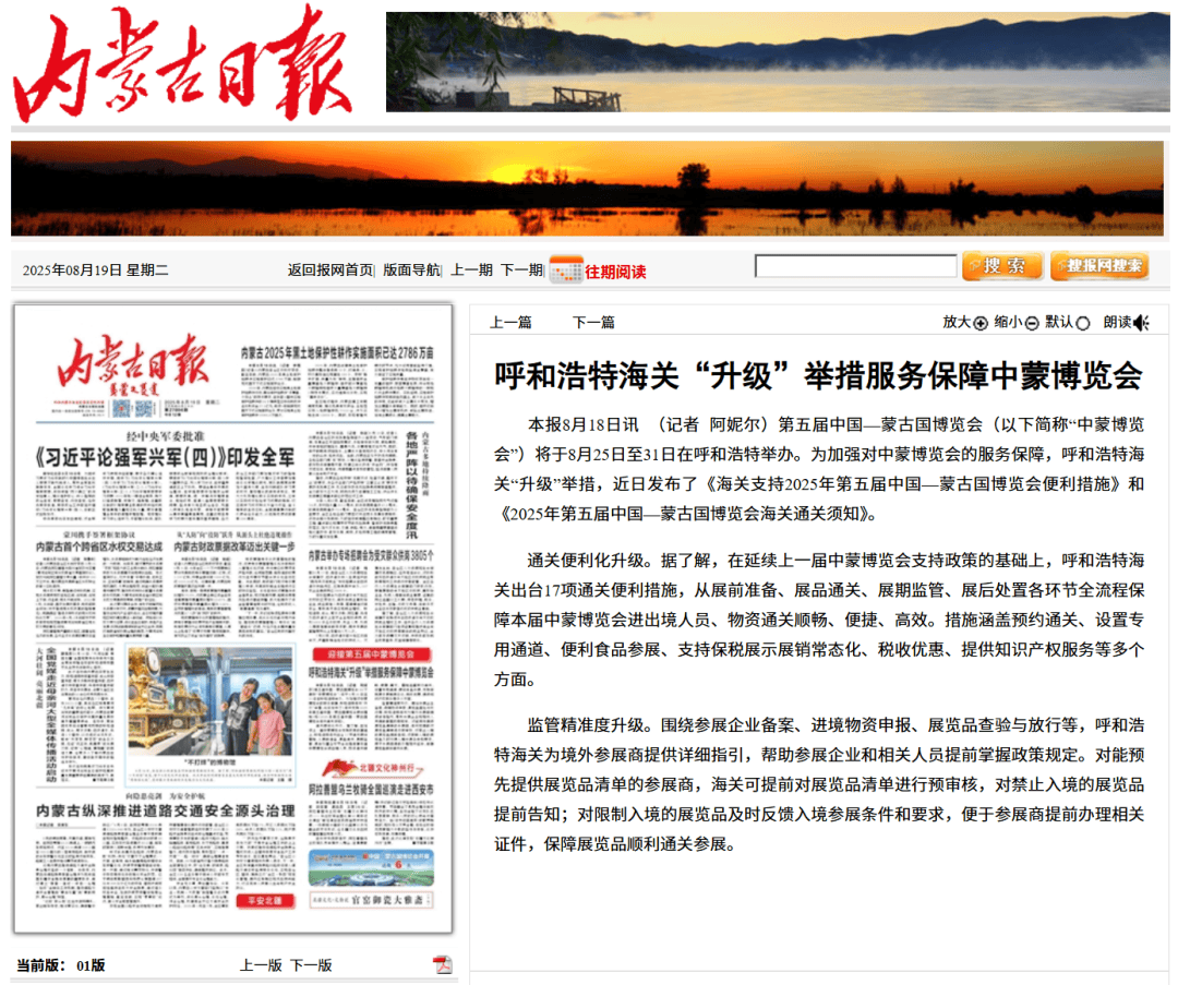 ●8月19日,《内蒙古日报》发布文章《呼和浩特海关“升级”举措服务保障中蒙博览会》。(口岸监管处供稿)