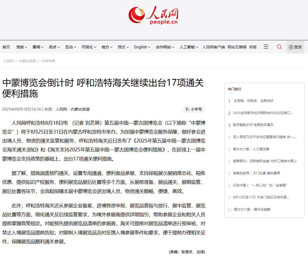 ●8月18日,人民网内蒙古频道发布文章《中蒙博览会倒计时 呼和浩特海关继续出台17项通关便利措施》。(口岸监管处供稿)