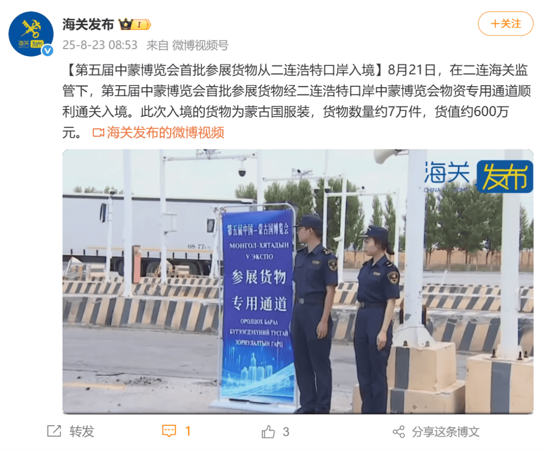 ●8月23日,《海关发布》微博发布视频《第五届中蒙博览会首批参展货物从二连浩特口岸入境》。(口岸监管处、二连海关供稿)