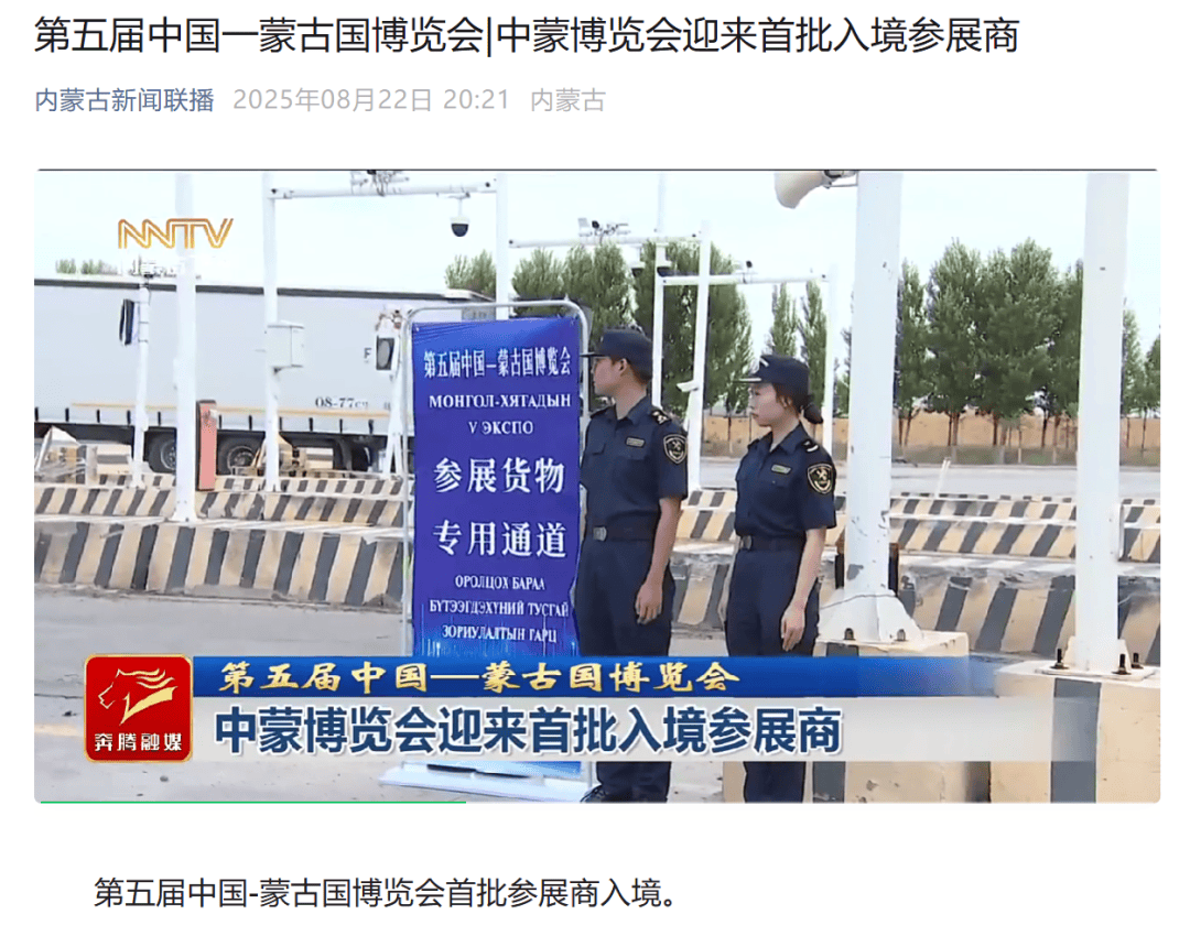 ●8月22日,《内蒙古新闻联播》微信公众平台发布文章《第五届中国一蒙古国博览会中蒙博览会迎来首批入境参展商》。(口岸监管处、二连海关供稿)