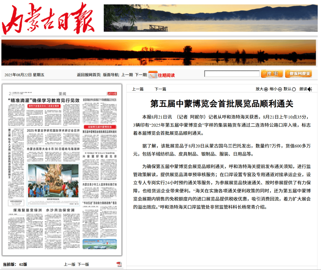●8月22日,《内蒙古日报》发布文章《第五届中蒙博览会首批展览品顺利通关》。(口岸监管处、二连海关供稿)