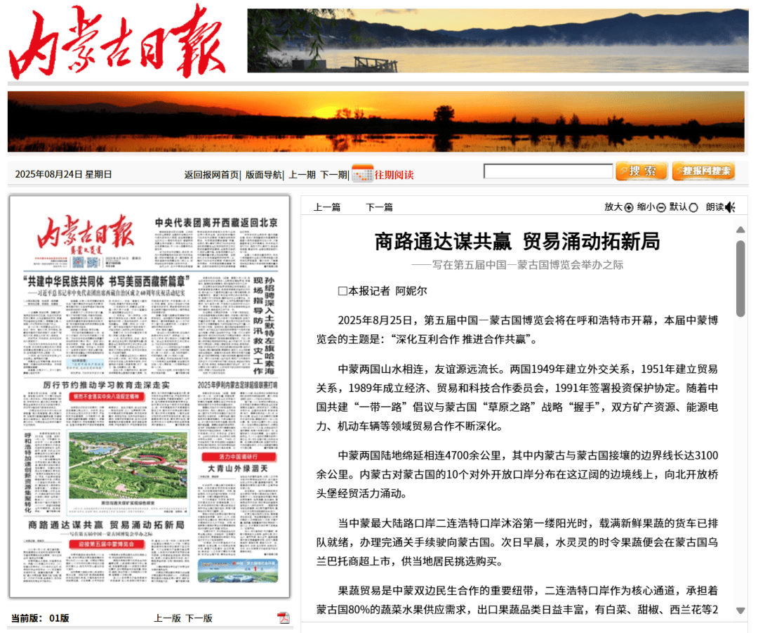 ●8月24日,《内蒙古日报》发布文章《商路通达谋共赢 贸易涌动拓新局》。(统计分析处、二连海关、乌拉特海关供稿)
