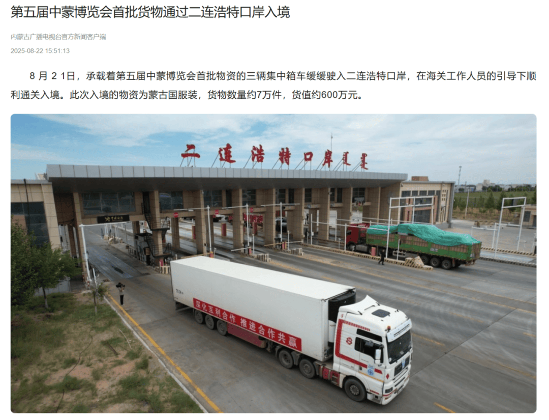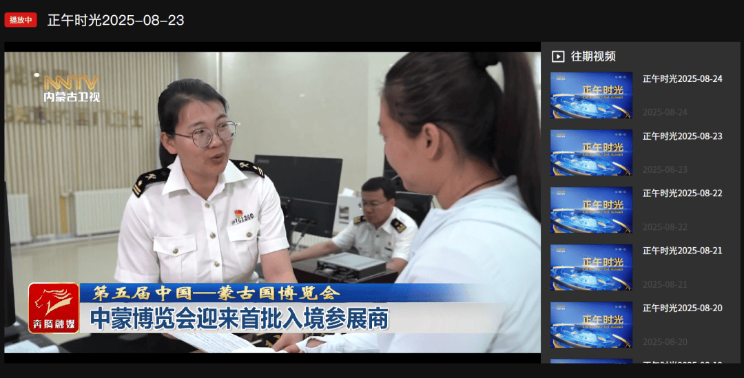 ●8月23日,内蒙古卫视《正午时光》发布视频《中蒙博览会迎来首批入境参展商》。(口岸监管处、二连海关供稿)