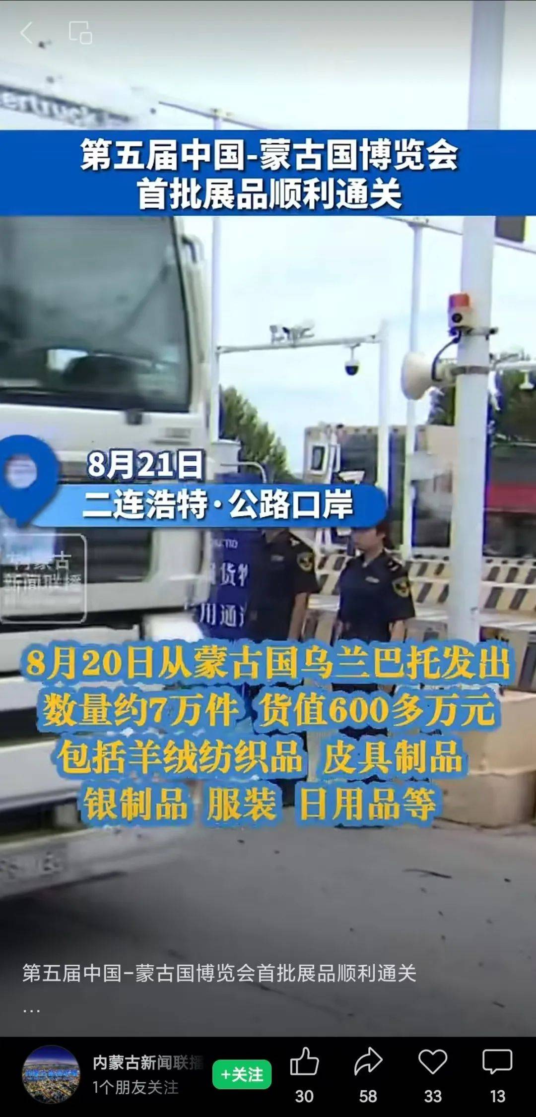 ●8月22日,《内蒙古新闻联播》微信视频号发布视频《第五届中国-蒙古国博览会首批展品顺利通关》。(口岸监管处、二连海关供稿)