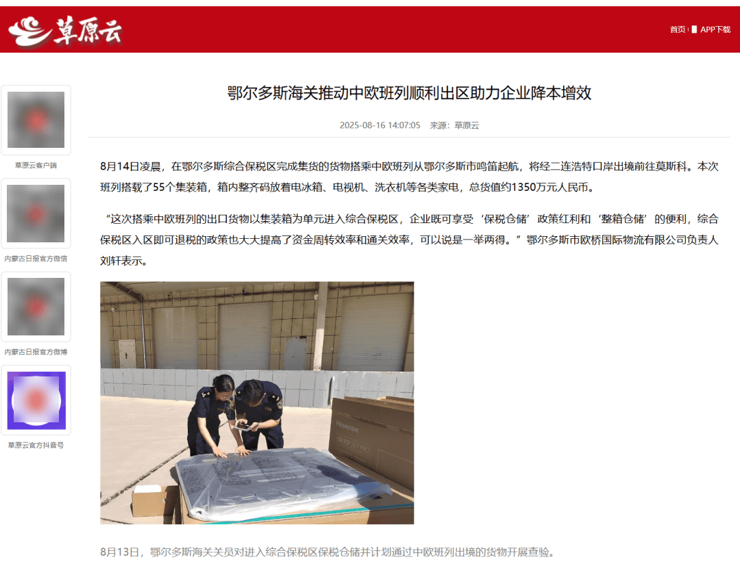 ●8月16日,《草原云》客户端发布文章《鄂尔多斯海关推动中欧班列顺利出区助力企业降本增效》。(鄂尔多斯海关供稿)