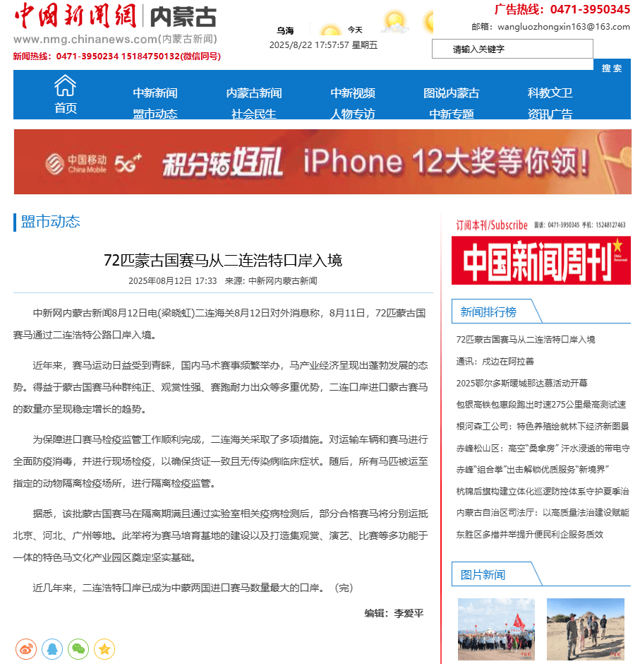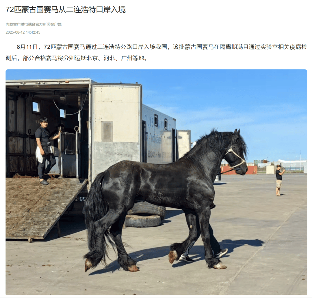 ●8月12日,中国新闻网内蒙古新闻发布文章《72匹蒙古国赛马从二连浩特口岸入境》。(二连海关供稿)