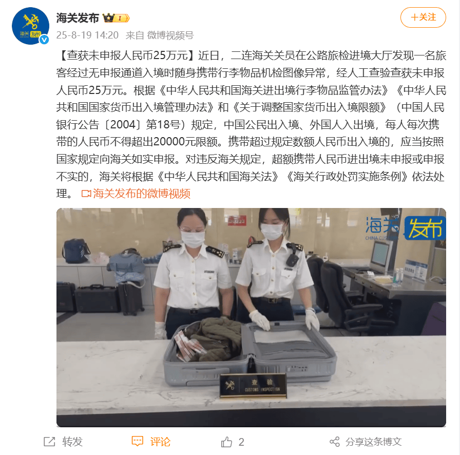 ●8月19日,《海关发布》微博发布视频《查获未申报人民币25万元》。(二连海关供稿)