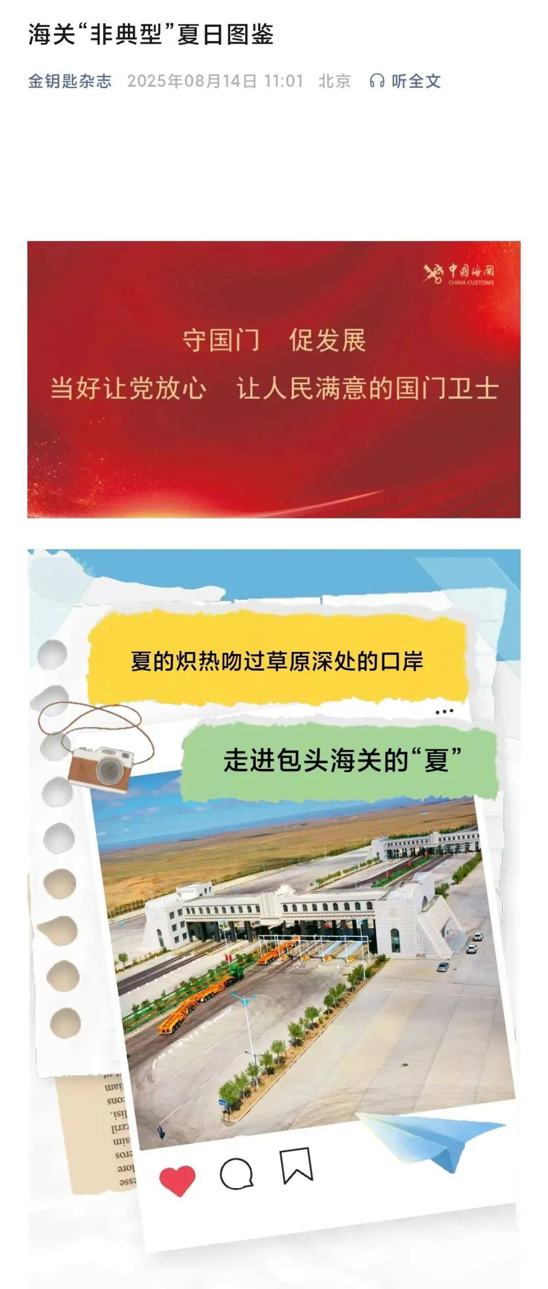 ●8月14日,《金钥匙杂志》微信公众平台发布文章《海关“非典型”夏日图鉴》。(机关党委、包头海关供稿)