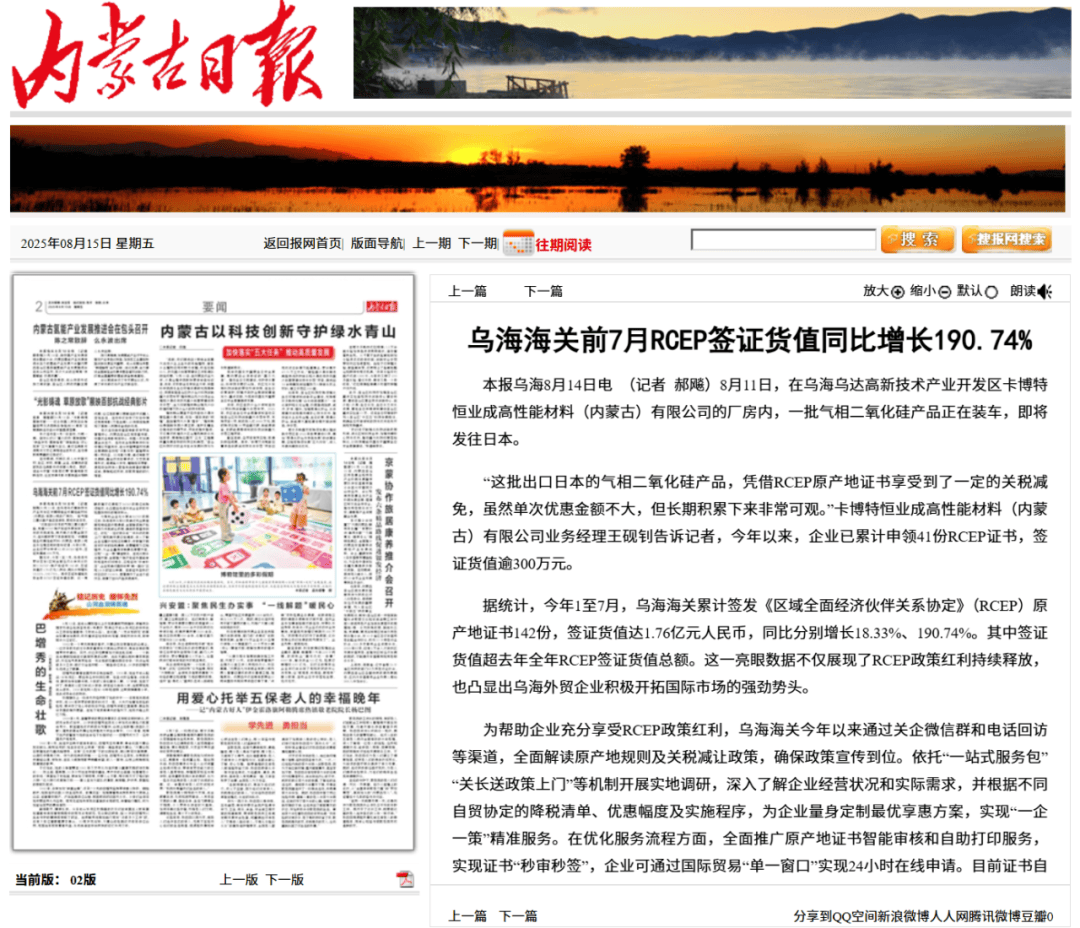 ●8月15日,《内蒙古日报》发布文章《乌海海关前7月RCEP签证货值同比增长190.74%》。(乌海海关供稿)