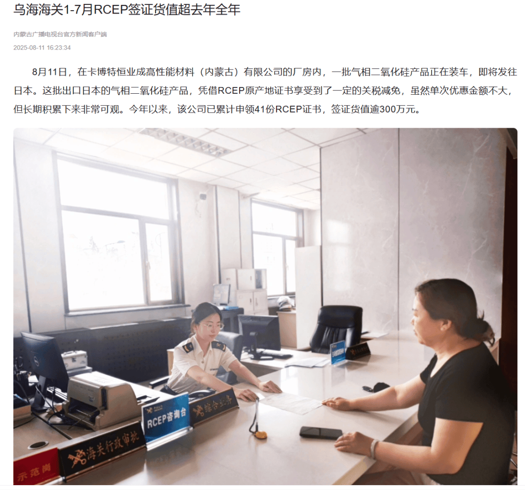 ●8月11日,《奔腾融媒》发布文章《乌海海关1-7月RCEP签证货值超去年全年》。(乌海海关供稿)