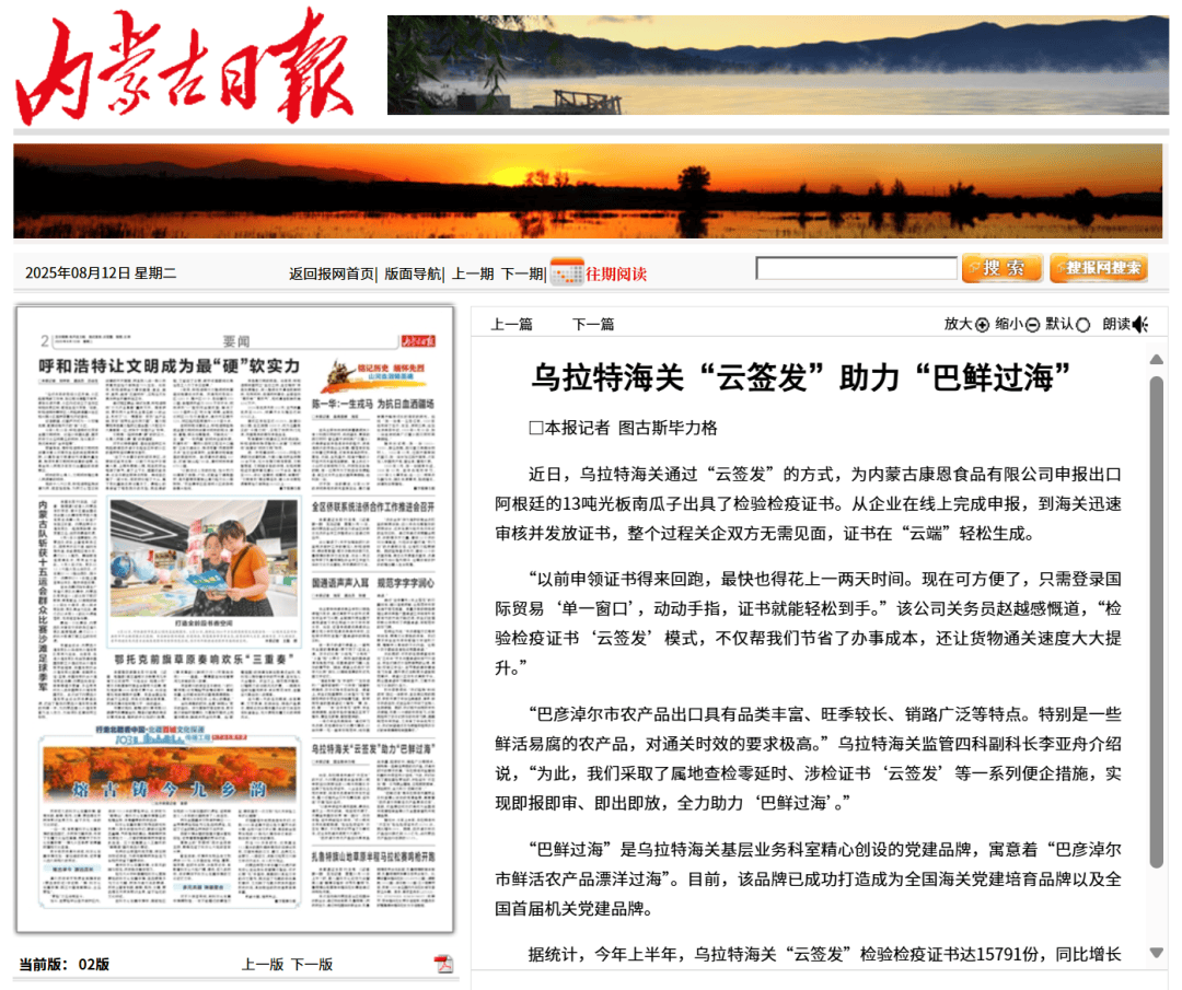 ●8月12日,《内蒙古日报》发布文章《乌拉特海关“云签发”助力“巴鲜过海”》。(乌拉特海关供稿)