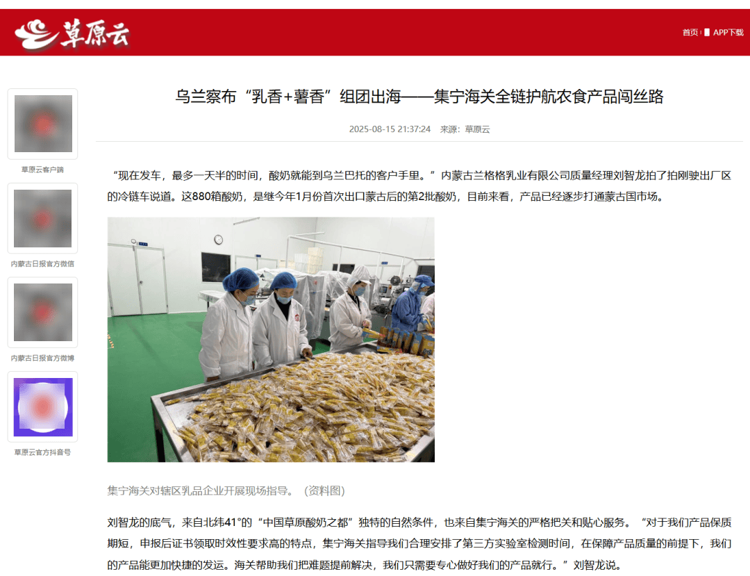 ●8月15日,《草原云》客户端发布文章《乌兰察布“乳香+薯香”组团出海——集宁海关全链护航农食产品闯丝路》。(集宁海关供稿)