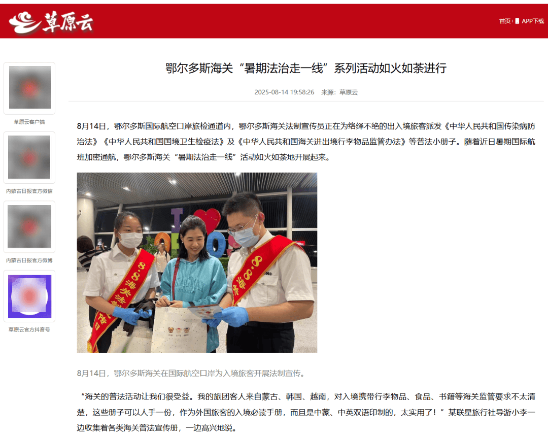 ●8月14日,《草原云》客户端发布文章《鄂尔多斯海关“暑期法治走一线”系列活动如火如荼进行》。(鄂尔多斯海关供稿)